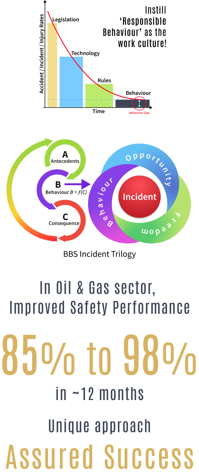 It takes an Opportunity or Freedom with uncontrolled / unregulated / at risk Behaviour to cause an incident. Behaviour stems out of work culture, beliefs about how past incidents were dealt with, etc. Leadership has a greater role to play. By instilling a self-regulating autonomous behaviour, even the existence of such opportunities and freedom would be disregarded to do things right! In Behaviour Based Safety, we focus on the ‘what’ and ‘why’ of people’s actions. We recognise the good and build interventions to address those that can be improved. We focus on ‘Why they do things the way they do?’ and help them overcome. Series of onsite assessments, observations, mentoring followed by classroom training, brings in a positive behavioural change and hence the culture.
