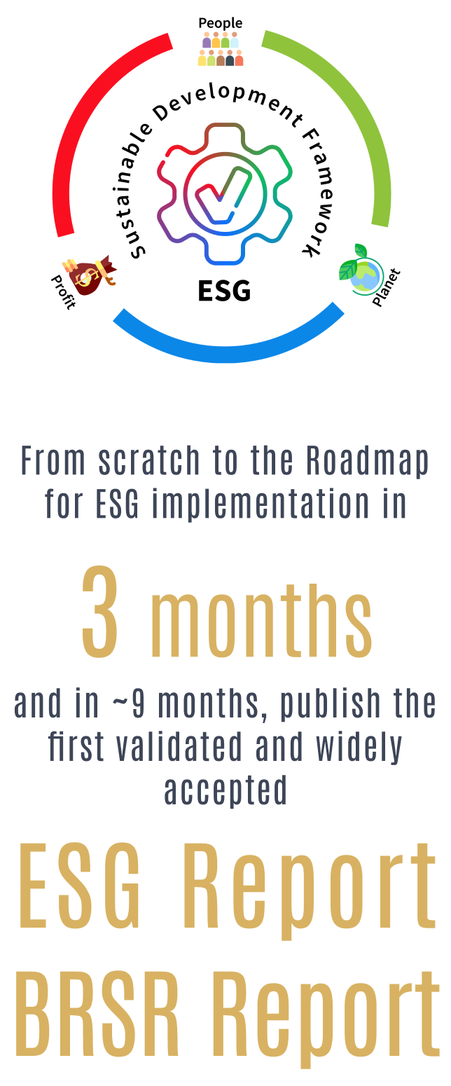 We design the ESG deployment for every individual client based on their infrastructure, capabilities and work culture, as no two organisations are the same. We train, mentor, coach and counsel your internal resource to become ESG Champions and lead the implementation & sustenance.